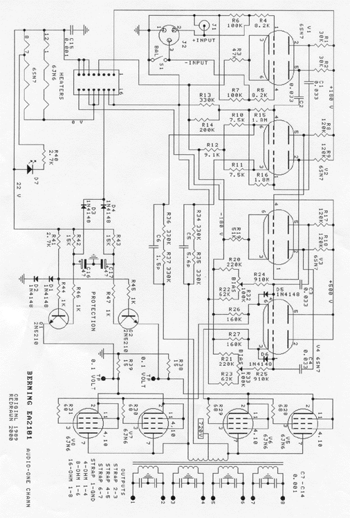 The failure prone parts in the EA-2101 are the four 150K resistors in the feedback sensing. Early versions used carbon film resistors that tended to increase in value, or go open completely, causing the output voltage of the power supply to increase until something else failed. Later versions of the amp used 1 W metal film resistors which have not shown failures. Any amps that have been returned to Berning for any kind of service have had these resistors changed. When this amp is serviced, the 700 volt output of the power supply should be checked. If it is high, more than 720 volts, these resistors should be checked.