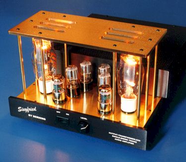 Berning has now applied this new technology to the single-ended amplifier, and Siegfried is the result of this effort. Prior to the Berning impedance conversion technology, it was simply too impractical to even consider building a tube OTL single-ended amplifier. Siegfried uses a regulated resonant switching power supply to achieve extremely low hum levels. This supply operates at 250 kHz. An important side benefit is that the heaters of the output tubes are heated with this RF through properly configured center-tapped transformers. No hum is generated, and the tubes have the proper equipotential cathodes with their true transfer function.