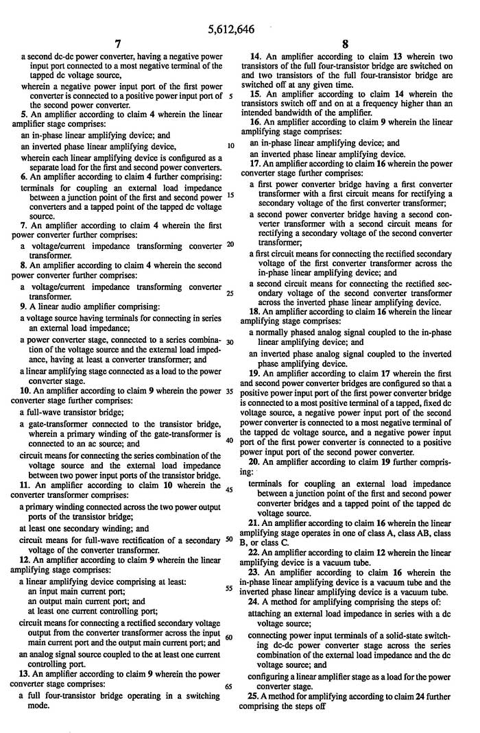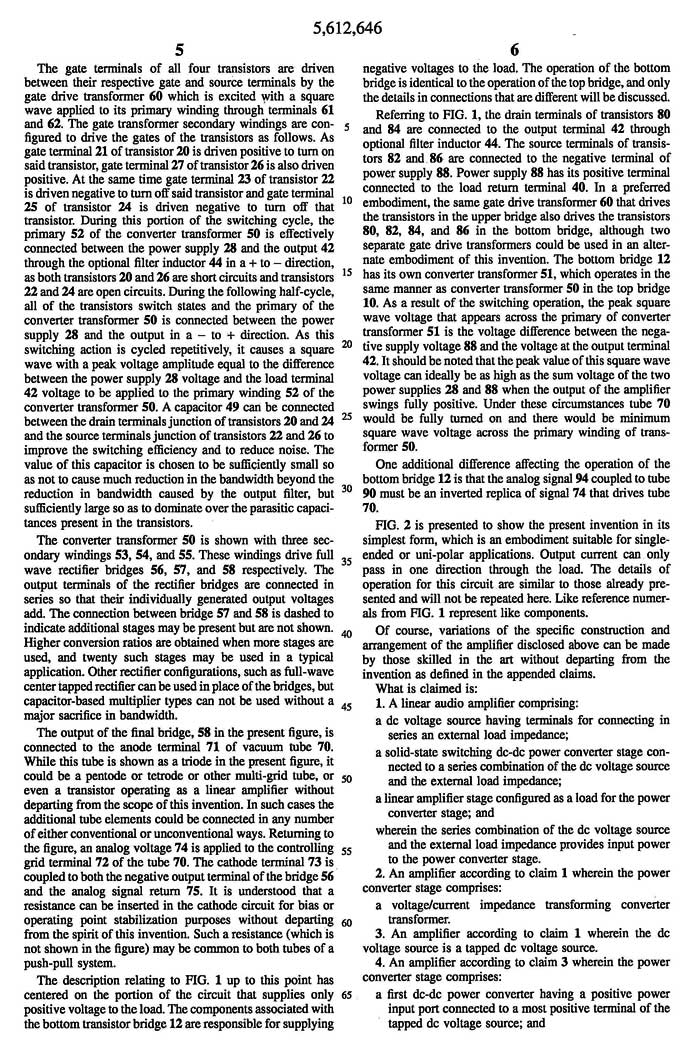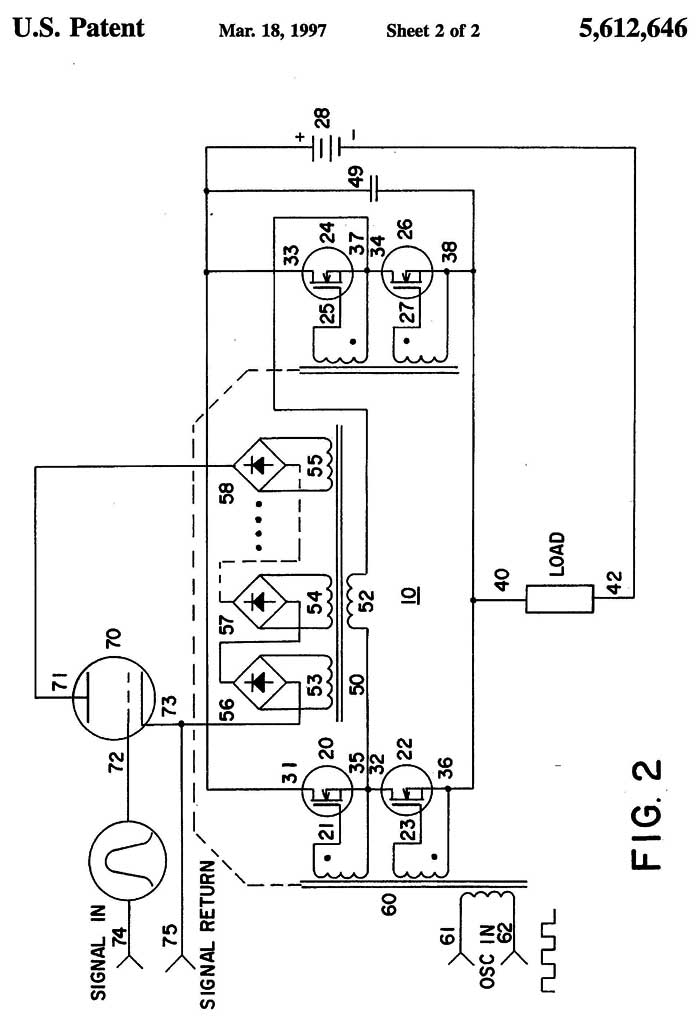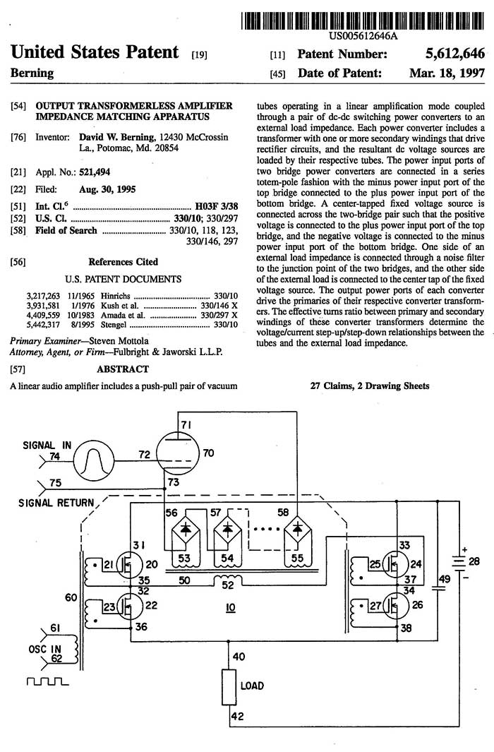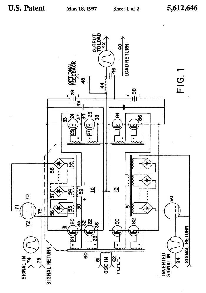 Patent 5,612,646 Output Transformerless Amplifier Impedance Matching Apparatus